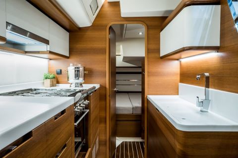 Auf der Steuerbordseite gibt es verschiedene Alternativen: Wenn sich die Galeere am Heck befindet und auf beiden Seiten entlang des Durchgangs zur Kabine angeordnet ist, gibt es ein weiteres Sofa, das am Bug mit dem Kartentisch endet. Alternativ können Sie sich in diesem Bereich für eine große Kombüse mit zentralem Arbeitsbereich entscheiden.