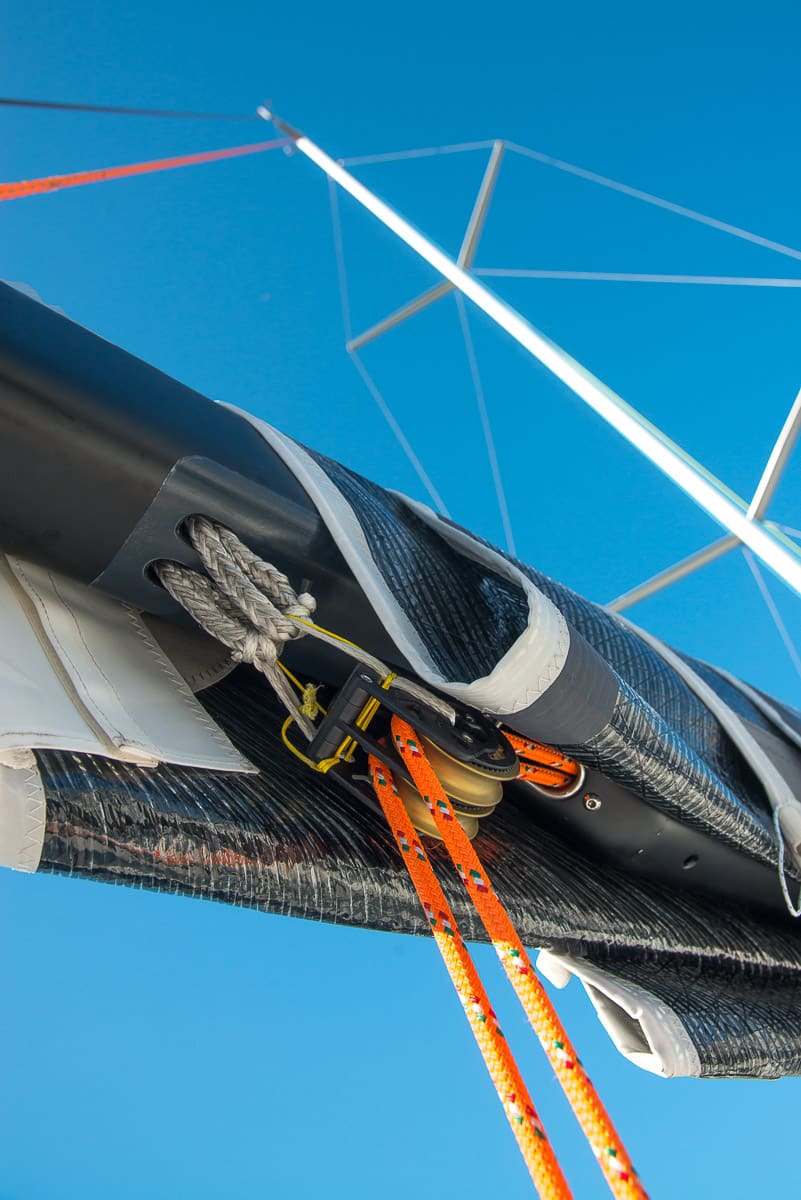Die Großschot für den Großbaum wird aus dem Cockpit bedient. Das geteilte Rigg und das Vortag besteht aus 1x19 Edelstahldraht mit offenen Wantenspannern. Optional erhältlich ist ein Rod-Rigg. Die Püttinge befinden sich an der breitesten Stelle des Rumpfes für maximale Mastunterstützung und einen sicheren Zugang zum Vordeck. Geliefert wird ein Kunststoffprofil am Vorstag, das Achetrstag ist aus Dyneema® mit geringer Dehnung, ebenso das komplette laufende Gut. Die Bellissima-Version ist standardmäßig mit einem abnehmbaren Bugspriet inklusive Ankerhalterung ausgestattet.